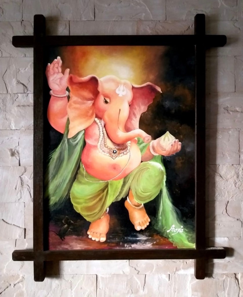 Young Ganesha dancing with joy! A symbolic representation of baby lord Ganesha dancing because he is happy and about to snack on a delicious ‘ladoo’.