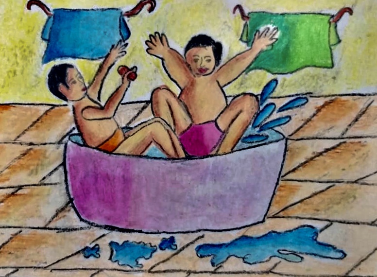 Two boys being mischievous in the bath room. Two towels for each. Wanted to make sure they were following proper hygiene.
