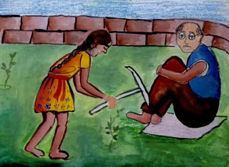 A drawing of two sisters watch flowers grow outside their home. Being an only child I always fancied the idea of having an older sibling.
